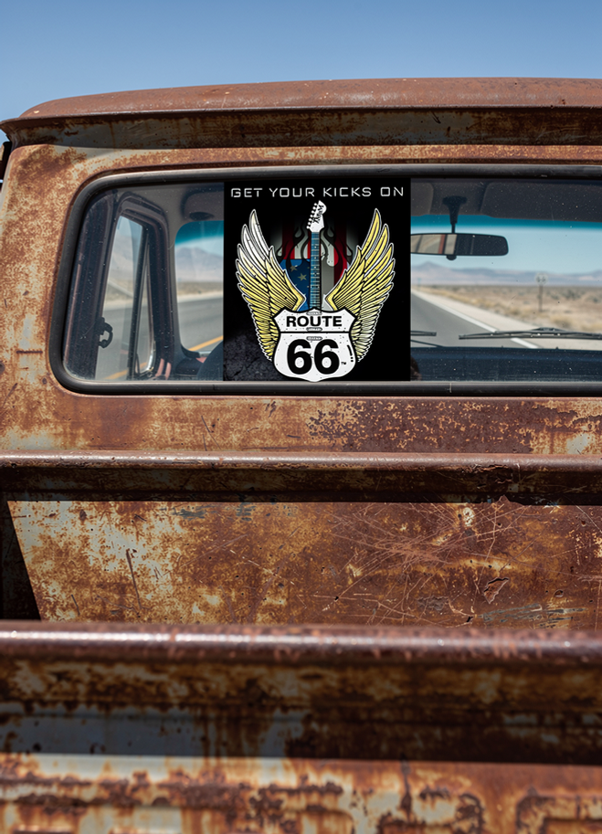 Route 66 Shield Winged Guitar Sticker available exclusively at Mother Road Music - Business card sized (small), Playing card sized (medium), and Post card sized (Large).
