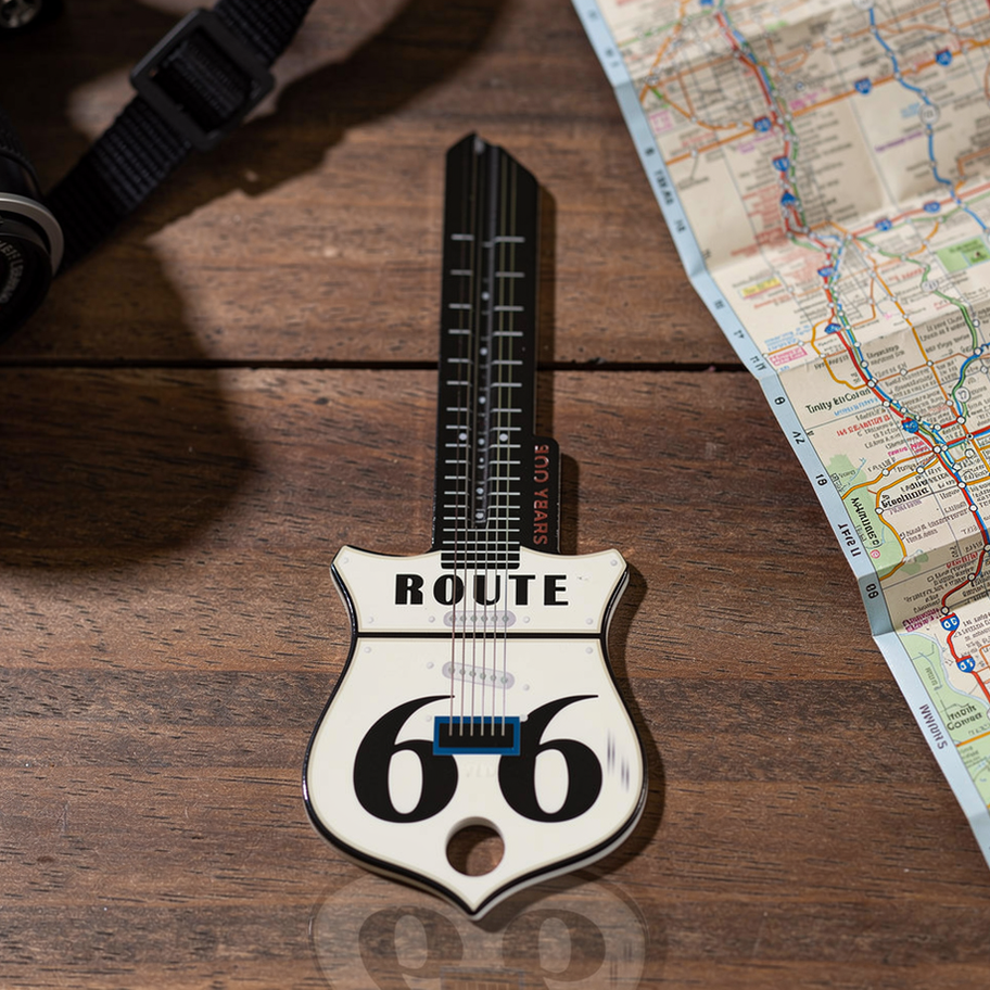 Unique Design: This quirky house key features a Route 66 guitar design, adding a touch of whimsy to your keychain with 100 Years stamped in red on the key.